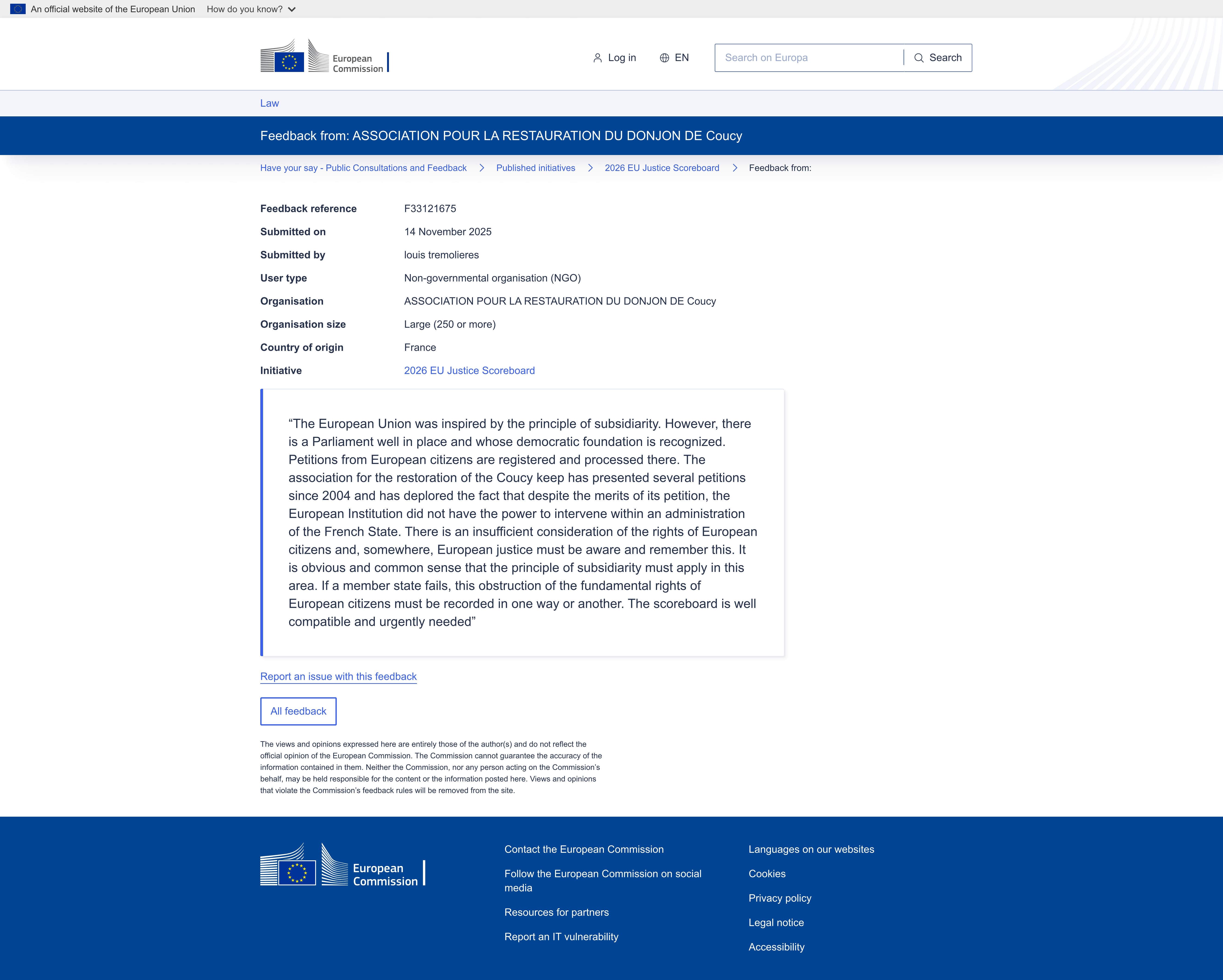 l'Ardocc et la commission Européenne Avec l'appui de Otto de Habsbourg en 1999, l'association sait que le donjon de Coucy a du sens en Europe et que la France n'assume pas la vérité historique en prenant grand soin de cacher le texte de Paul Doumer pour ne pas désavouer des paradigmes d'une idéologie radicale partisane et belliciste. L'Ardocc depuis 2004 a saisi l'Europe par des pétitions. Ce mode de saisine s'est avec le temps et la construction européenne solidifié et la Commission Européenne vient d'ouvrir le dialogue direct aec les citoyens, associations, et organisations publiques par la procédure Have you Say ! Feedback reference :F3562064 )Submitted on 29 May 2025 Submitted by louis tremolieres User type EU citizen Country of origin France Initiative Political advertising – guidance on implementing EU rules Political advertisements of all kinds (Political advertising) with societal and economic purposes constitute the primary food of democracy. Beneficial or poisonous, they are often impossible to distinguish at first glance. They must therefore be welcomed and examined with care and lasting consistency. The need for constancy must require that petitions made to Parliament, recognized and approved, be followed up with effect. The Ardocc (Association for the restoration of the keep of Coucy-le-château) obtained the approval of petitions requesting the obsolescence of texts imposing "a maintenance in ruins to show future generations the barbarity of the German people". Petition 1267/2025; This approval from Parliament is accompanied by a statement that Parliament and Europe do not have the possibility of intervening with the Aisne Departmental Council which issued this edict. What use can these rights to petition have if they are not accompanied by any political act? Peace in Europe and the defense of its civilization require that this text of hatred be formally and publicly obsolete and denounced. The European Union, through this symbolic act, would clearly indicate the path to the proper institutionalization of political announcements. en Français Les "annonces politiques" de toutes natures (Political advertising) à objets sociétaux comme économiques constituent l'aliment premier de la démocratie . Bénéfiques ou poisons, ils sont souvent impossibles à distinguer au premier abord . Il faut donc les accueillir et les examiner avec soin et en constance durable. La nécessité de la constance doit imposer que les pétitions faites au Parlement, reconnues et approuvées soient suivies d'effets . L'Ardocc( Association pour la restauration du donjon de Coucy-le-château a obtenu l'agrément de pétitions demandant la caducité de textes imposant "un maintien en ruines pour montrer aux générations futures la barbarie du peuple allemand ". Pétition 1267/2025; Cet agrément du Parlement est assortie d'une mention selon laquelle, le Parlement et l'Europe n'ont pas la possibilité d'intervenir auprès du Conseil départemental de l'Aisne qui a émis cet édit . A quoi peuvent servir ces droits à pétition s'ils ne sont assortis d'aucun acte politique ? . La paix en Europe et la défense de sa civilisation imposent que ce texte de haine soit formellement et publiquement caduc et obsolète . L'Union Européenne par cet acte symbolique indiquerait clairement la voie d'une bonne institutionnalisation des annonces politiques. Feedback from: louis tremolieres EN (1.2 MB - PDF - 3 pages) -------------------- Have you say upon Whistleblowing 09/2025 association pour la restauration du donjon de Coucy-le-Château (France) In the current power structure of the European Commission, it is, in fact, very necessary that the protection of whistleblowers be precise, applied and contradictory. States, including France, at its different administrative and political levels rarely take into account the institutions and objectives of the European Union. The most obvious is France's lack of involvement in the resolution on "European historical awareness". How Europe have to tolerate that the most strong Keep ( Dungeon) has to stay in ruin to "show to the future générations the barbarity of the german people " which hasn't be cancelled by the french authorities . And how to tolerate that the voice of those who ask for caducity of the maintaining in ruin and of the hate including the stay find no formal answer nor sustain ? Whistleblowing has to whistle on and on ........ Underwrited by Association pour la restauration du donjon de Coucy-le-château www.ardocc.com -------------------- Have you say upon justice scoreboard 11/2025
