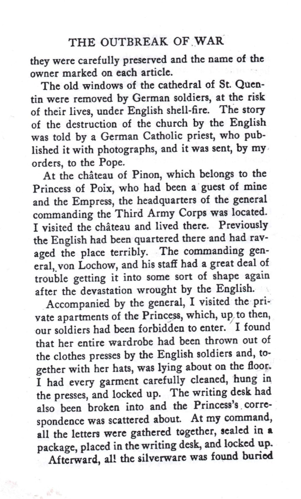 Pages 272 à 274, suite et fin du chapitre d'Outbreak of War , Elles évoquent la protection des biens culturels (dont les châteaux) pendant l'occupation et particulièrement la démolition par les alliés du château de Pinon, qui a été à l'origine un château fort des Enguerrand de Coucy . Bien qu'anecdotiques, elles argumentent contre l'accusation de comportement en "Huns, boches" généreusement employé dans le narratif occidental.