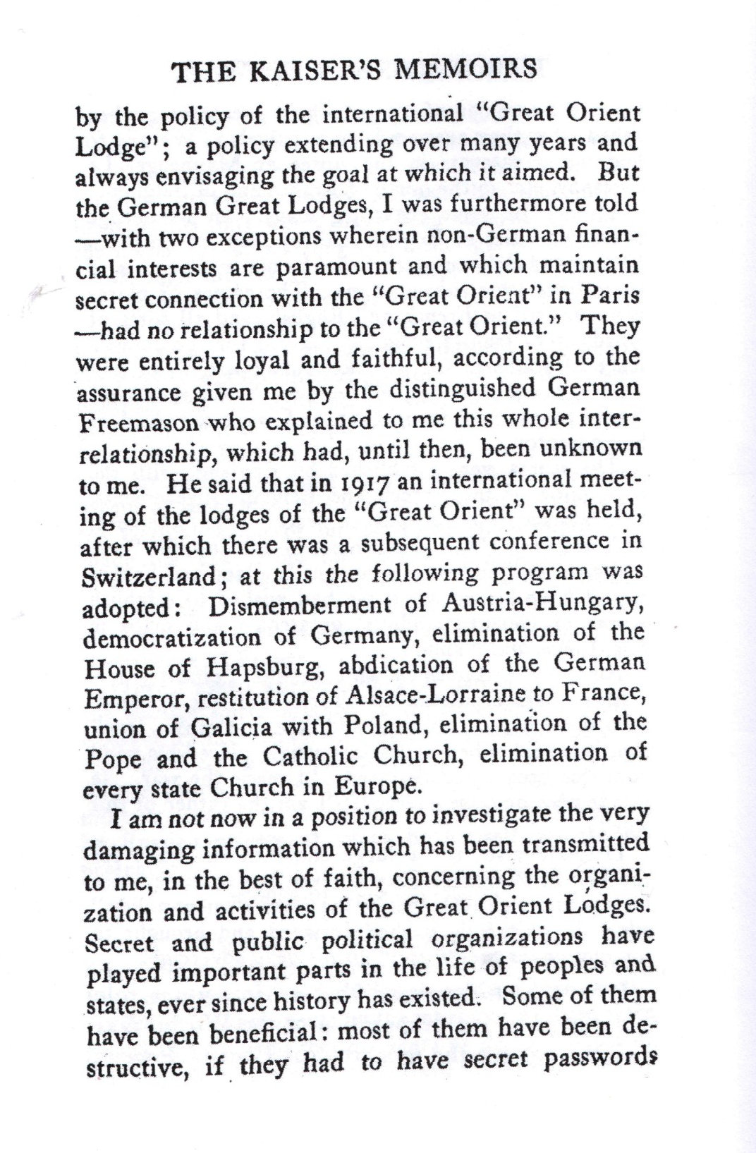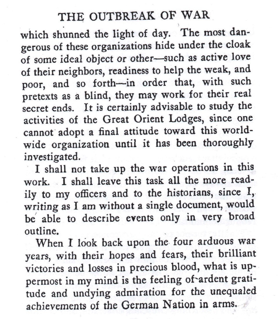 Guillaume 11, qu'a t'il dit dans ses mémoires ? L'empereur d'Allemagne est venu à Coucy et il a séjourné un certain temps à Saint-Quentin, Pinon, Laon . Dans son livre de mémoires, on est étonné par sa grande culture de l'histoire européenne et par l'usage de la langue française. N'était-elle pas la langue internationale que Clémenceau fera disparaître au profit de l'anglais ? Quand il abdiqua, il dit avoir, en celà, suivi Vercingétorix qui, lui aussi, préféra le renoncement par souci pour son peuple . On relève aussi que, bien que très soucieux de l'expansionnisme de l'Empire, il avait su le limiter au Maroc et dans d'autres régions du monde. Concernant la première guerre mondiale, il écrit qu'il était un très proche ami de l'archiduc Ferdinand, assassiné à Sarajevo. Cet attentat a effectivement mis le feu aux poudres d'ententes diplomatiques dont les finalités étaient bien la guerre . L'Angleterre est placée par lui en première place, la Russie tsariste juste derrière. Quant à la France, il en comprend assez le désir de revanche après la défaite de 1870. Pour le cours de la guerre, il semble s'être peu impliqué et avoir accordé une confiance absolue à Hindenburg et Luddendorf Les pages, qui dans son livre concernent directement la France, sont reprises çi-dessous. Pages 269 à 271 du chapitre Outbreak of war . Celles-ci sont d'une grande prudence diplomatique mais assez claires, surtout quand on connaît le volet français de l'histoire et la culture d'occultisme, secret, mépris du petit peuple et spiritualité qui a dominé longtemps et survit encore au travers du refus de caducité !