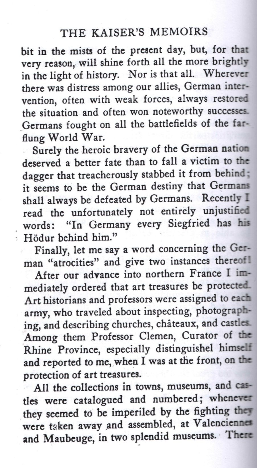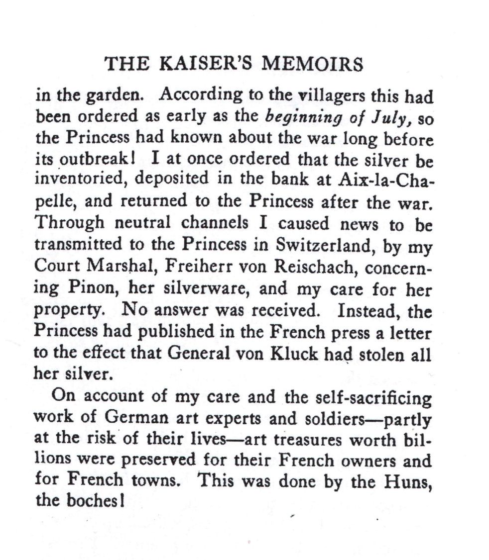 Pages 272 à 274, suite et fin du chapitre d'Outbreak of War , Elles évoquent la protection des biens culturels (dont les châteaux) pendant l'occupation et particulièrement la démolition par les alliés du château de Pinon, qui a été à l'origine un château fort des Enguerrand de Coucy . Bien qu'anecdotiques, elles argumentent contre l'accusation de comportement en "Huns, boches" généreusement employé dans le narratif occidental.