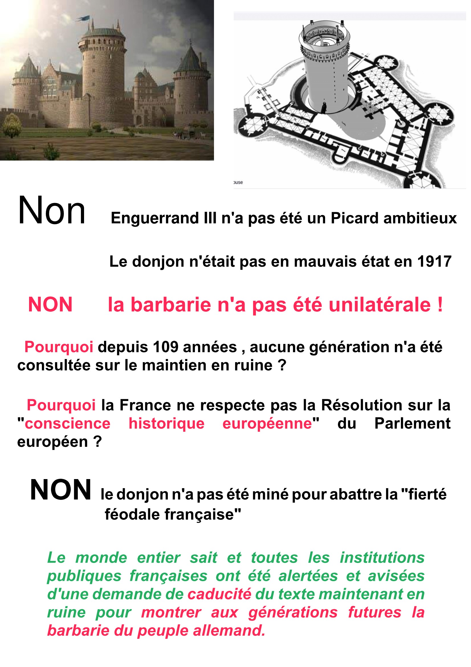Situation de l'Ardocc dans sa quête pour la caducité . Toute la puissance publique a été saisie.. Voir, en lien, les correspondances sans aucune marque d'attention, ni réponse . Il est clair que l'Etat français s'en tient à l'immobilisme, occultation et ne tient pas compte de la résolution du Parlement européen sur la "Conscience historique européenne". En ne donnant pas suite à la requête en caducité, l'Etat confirme le "maintien en ruine pour montrer aux générations futures la barbarie du peuple allemand. " _______________ L'Ardocc a fait part de sa requête aux institutions européennes qui savent et approuvent sa démarche mais ne peuvent pas encore contraindre la puissance publique française à l'un quelconque de ces niveaux décisionnels. Cette situation est prioritairerment embarrassante pour Arte, chaîne de télévision franco-allemande; qui ignorait l'existence du texte Doumer et s'est vue contrainte de limiter la diffusion de l'Invitation au Voyage à Coucy, Elle reste toujours catastrophique pour les habitants du sud de l'Aisne, voire du monde entier, car cette ruine spolie les populations environnantes, depuis 109 années, de revenus touristiques qui se chiffrent en milliard d'euros alors que la restauration s'élèverait à quelques petits millions. ______________ Il s'avère désastreux que l'Etat continue à camper sur son immobilisme, réprouvé même par les descendants de Paul Doumer, sans motif ni raison. L'Ardocc, avec ses amis, a fait ses recherches et pense avoir cerné la Vérité historique et les mauvaises raisons de cet héritage insupportable . |