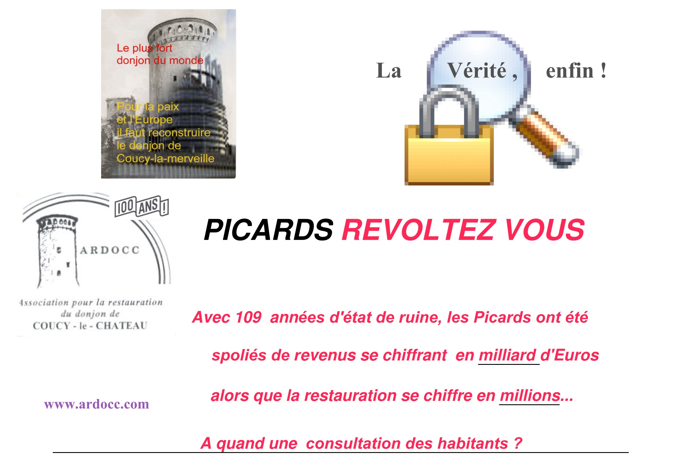 Par sa proclamation, l'Ardocc se positionne en opposition frontale avec la pensée profonde de l'Etat profond qui ne veut pas que les générations futures sachent autre chose que ce que l'enseignement officiel enseigne encore ! Ce qui est malheureusement trés biaisé, idéologique, et peu pacifique . Ainsi, la non-réponse de l'Etat oblige l'Ardocc à diffuser ce qu'elle sait, volens-nolens, sans autre moyen qu'une volonté de clarté, paix et fraternité entre les peuples allemands et français. Pour cela, l'Ardocc invite tous les citoyens du monde à rejoindre l'EuropaPaxorder. ordre de chevalerie dont l'adage est celui d'Enguerrand III: Sont Sires de Coucy, tous ceux qui " Ni roy, Ni duc, ni comte aussi , sont Sires de Coucy " en participant financièrement à la reconstruction. Tous les narratifs du Centre des Monuments Nationaux, occultant la vérité, seront combattus. La famille Doumer, dont l'honorabilité est bafouée par le maintien d'une volonté temporaire, à durée limitée, perpétuée sans consultation des descendants, sera honorée d'une plaque commémorative en l'honneur de son aïeul, dès que la restauration aura commencée . Un parrainage sera reconnue à la famille des Habsbourg-Lorraine qui, liée aux Enguerrand de Coucy, a aussi proposé à la France une Paix qui aurait évité les destructions cataclysmiques de la première guerre mondiale. Les responsabilités énormes des mouvements poliques radicaux de la troisième République seront évoquées , n'en déplaise aux thuriféraires des Clémenceau, Viviani, Ribot et autres. La République,en refusant la caducité, rend cette diffusion nécessaire et il serait sage et avisé pour les défenseurs de ce mouvement politique qu'ils approuvent la caducité plutôt que de devoir affronter l'opprobre! EN BON ENTENDEUR, BONJOUR ! : |