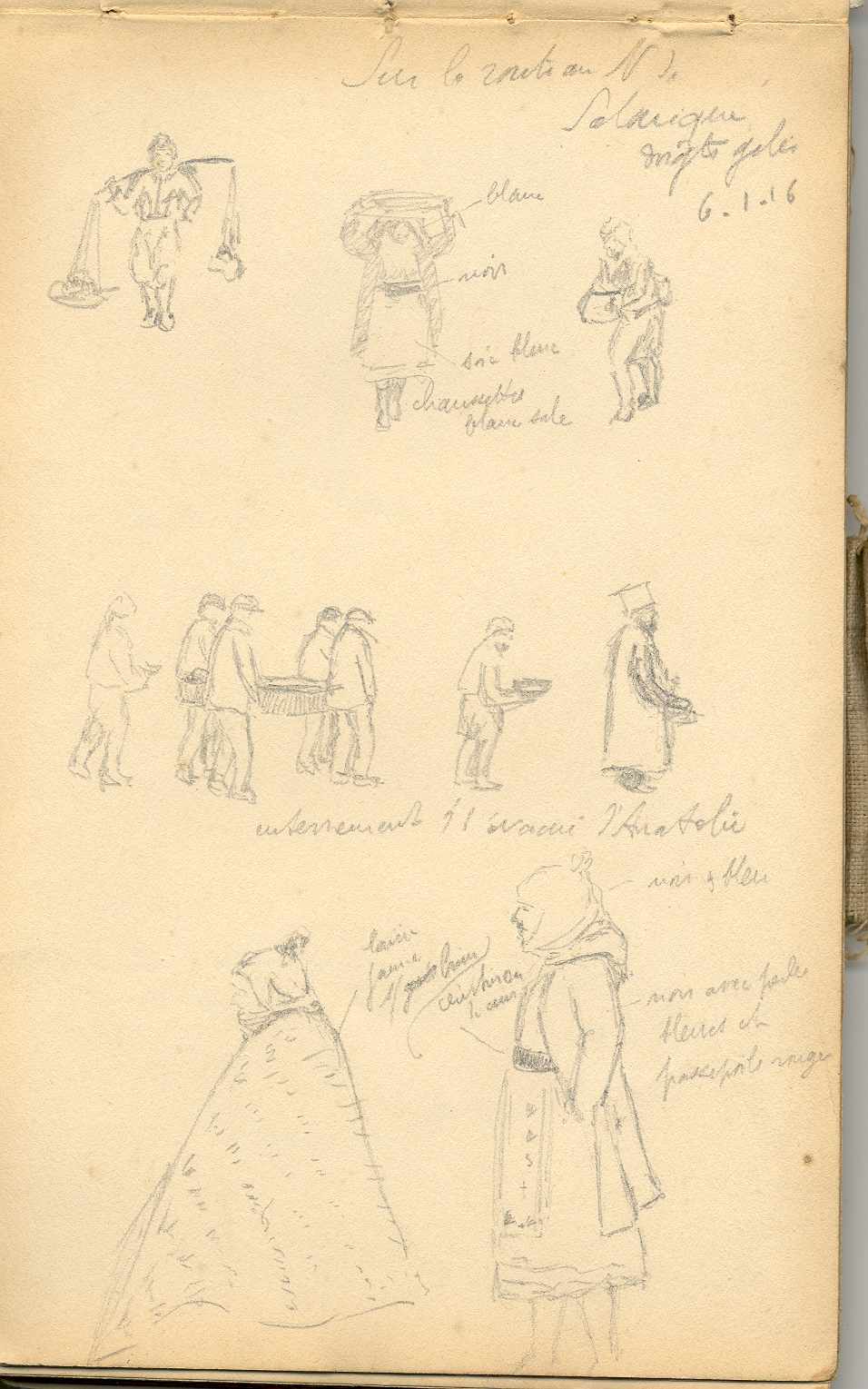 Sur la route de Salonique, doigts gelés, 6/1/16. Blanc/noir/soie blanc/chaussettes blanc sale; enterrement d'un évacué d'Anatolie ; laine jaune... noir avec... bleues et passepoli rouge